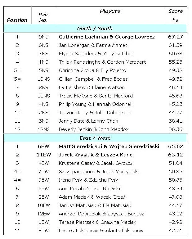 Turniej rozgrywany metodą przejść Michella. Duplicates played using the Mitchell movement.